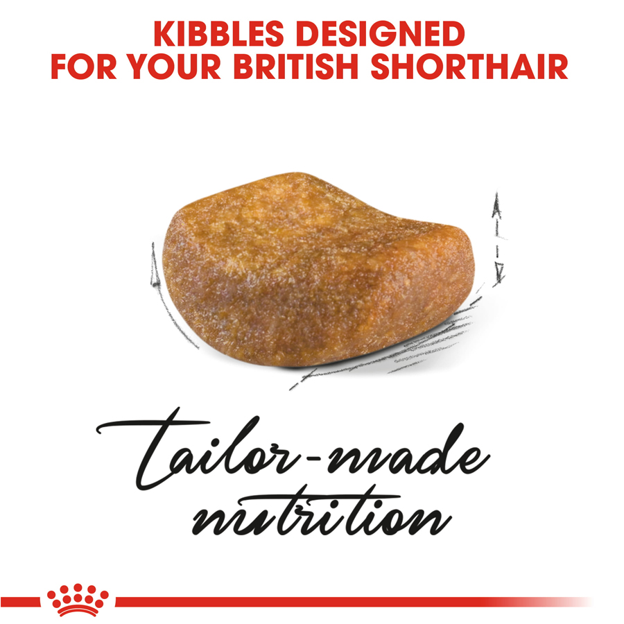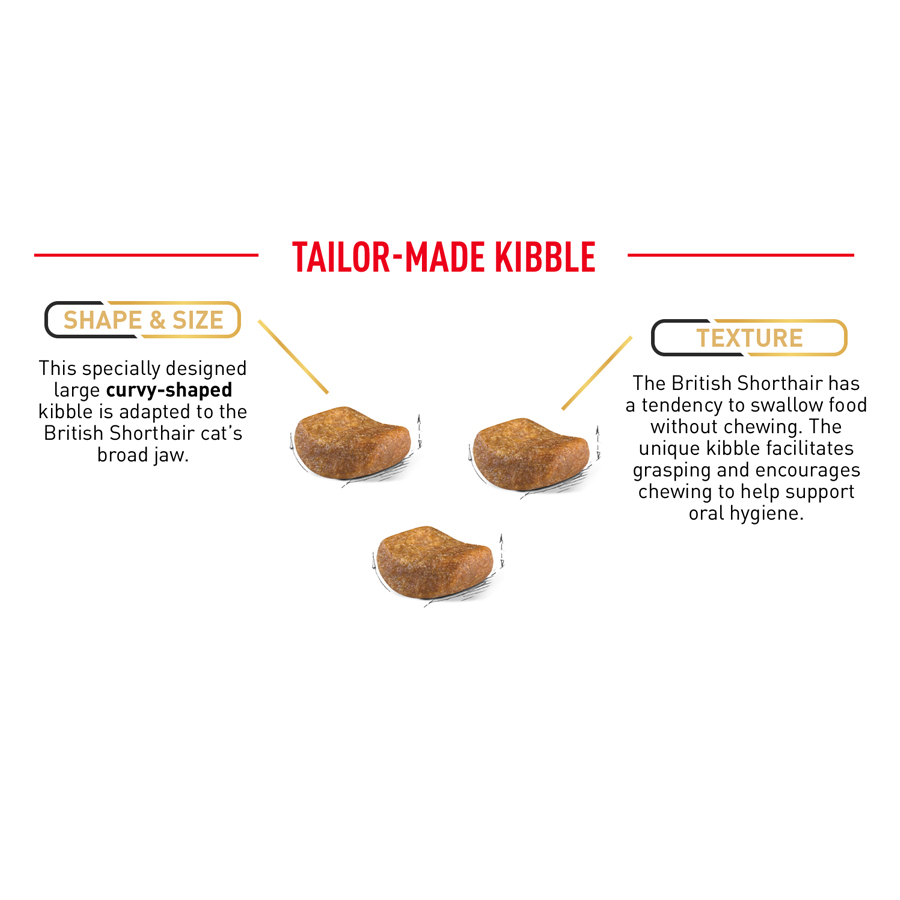 This specially designed large curvy-shaped kibble is adapted to the British Shorthair cat's broad jaw. The unique kibble facilitates grasping and encourages chewing to help support oral hygiene.